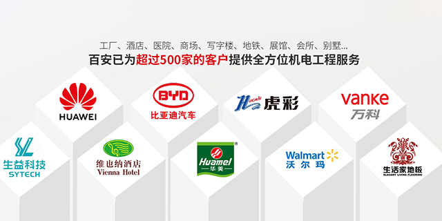 为超过500家客户提供了咨询、设计、施工、维护、保养等全方位的服务,服务领域涵盖工厂、酒店、医院、商场、写字楼、地铁、展馆、会所、别墅等各类场所。